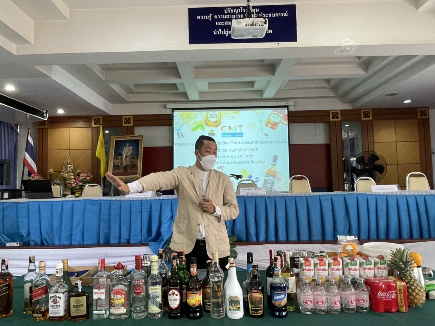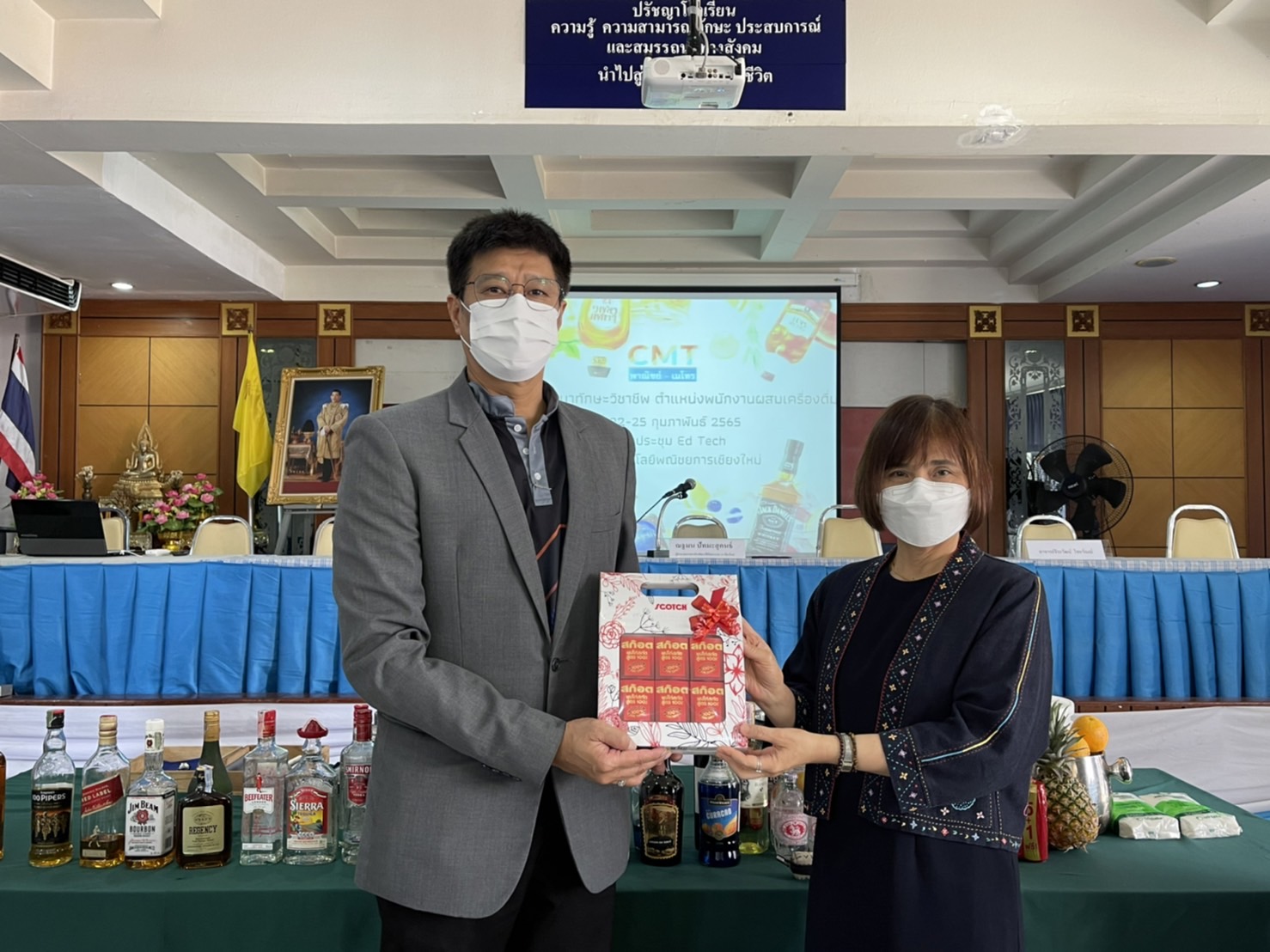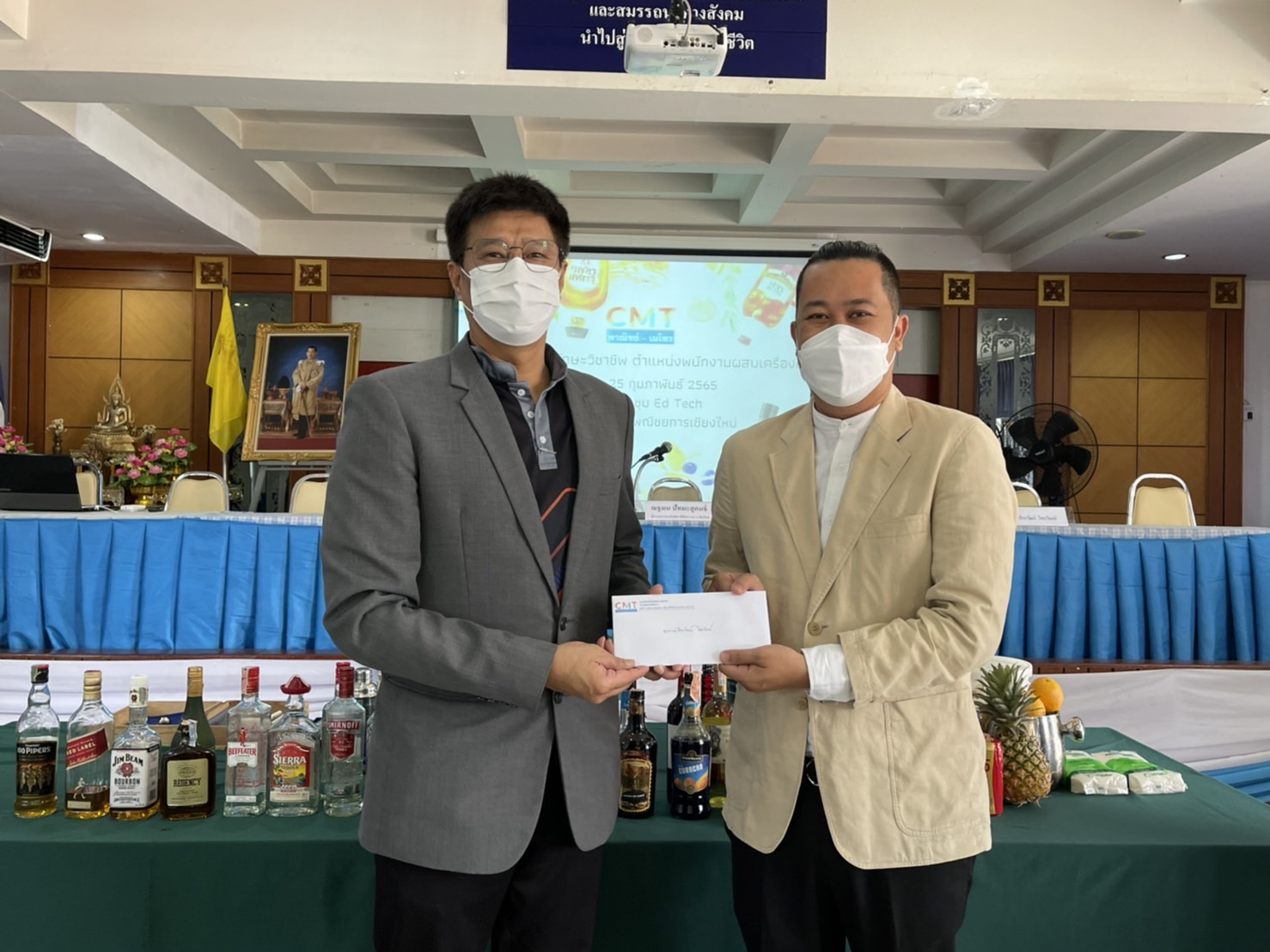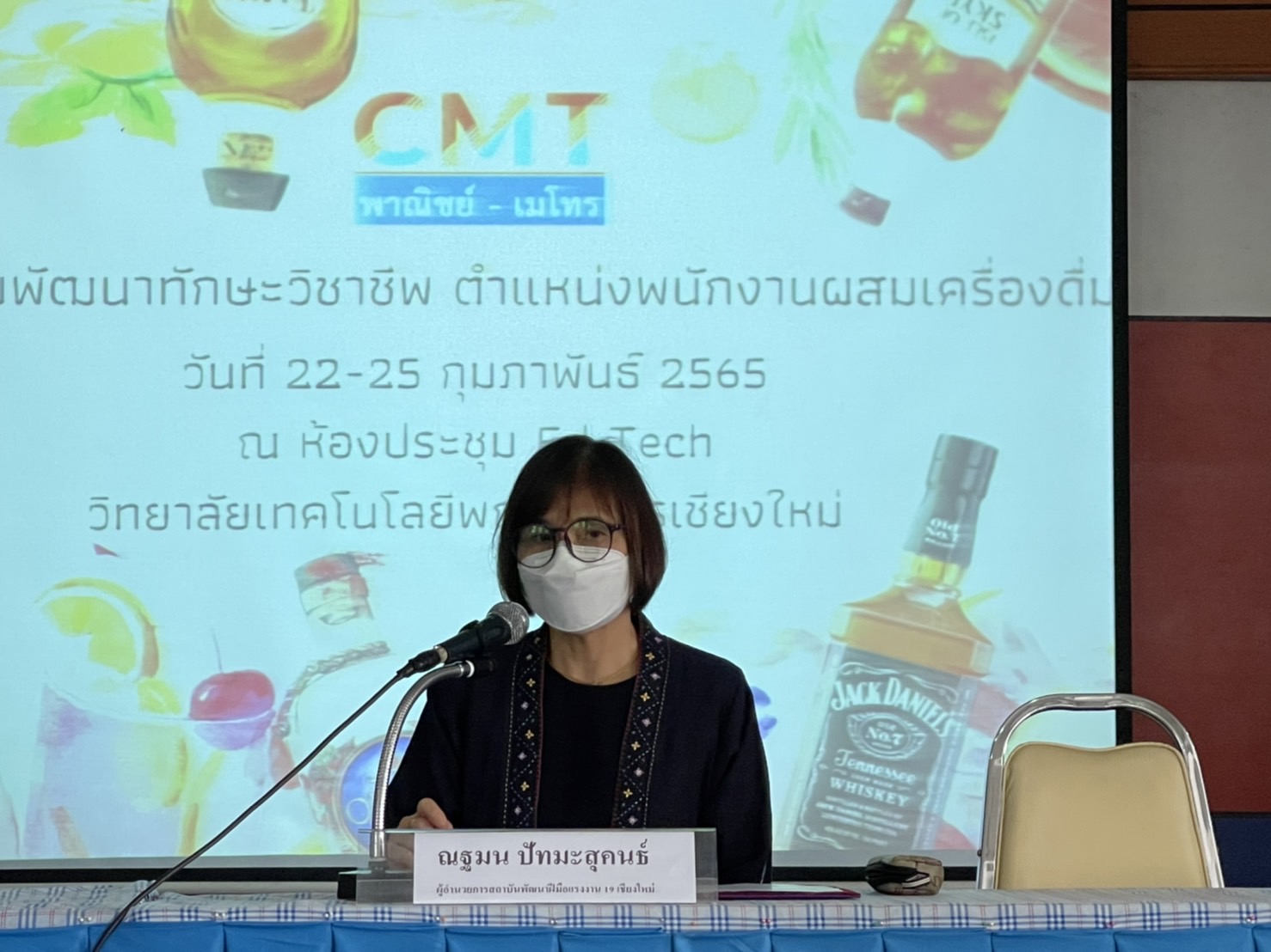 นายมารุต ศิริธร ผู้อำนวยการ และผู้บริหาร สถาบันกลุ่ม CMT พาณิชย์-เมโทร ให้การต้อนรับ คุณณฐมน ปัทมะสุคนธ์ ผู้อำนวยการสถาบันพัฒนาฝีมือแรงงานเชียงใหม่ 19 ได้ให้เกียรติมาเป็นประธานกล่าวเปิดการอบรมพัฒนาทักษะวิชาชีพ ตำแหน่งพนักงานผสมเครื่องดื่มของนักศึกษาแผนกการจัดการธุรกิจท่องเที่ยว ระดับ ปวช.3 และ ปวส.1 และ อาจารย์ จีระวัฒน์ ไชยวัณณ์ วิทยากรให้ความรู้ในการอบรมครั้งนี้ ในวันที่ 22 กุมภาพันธ์ 2565